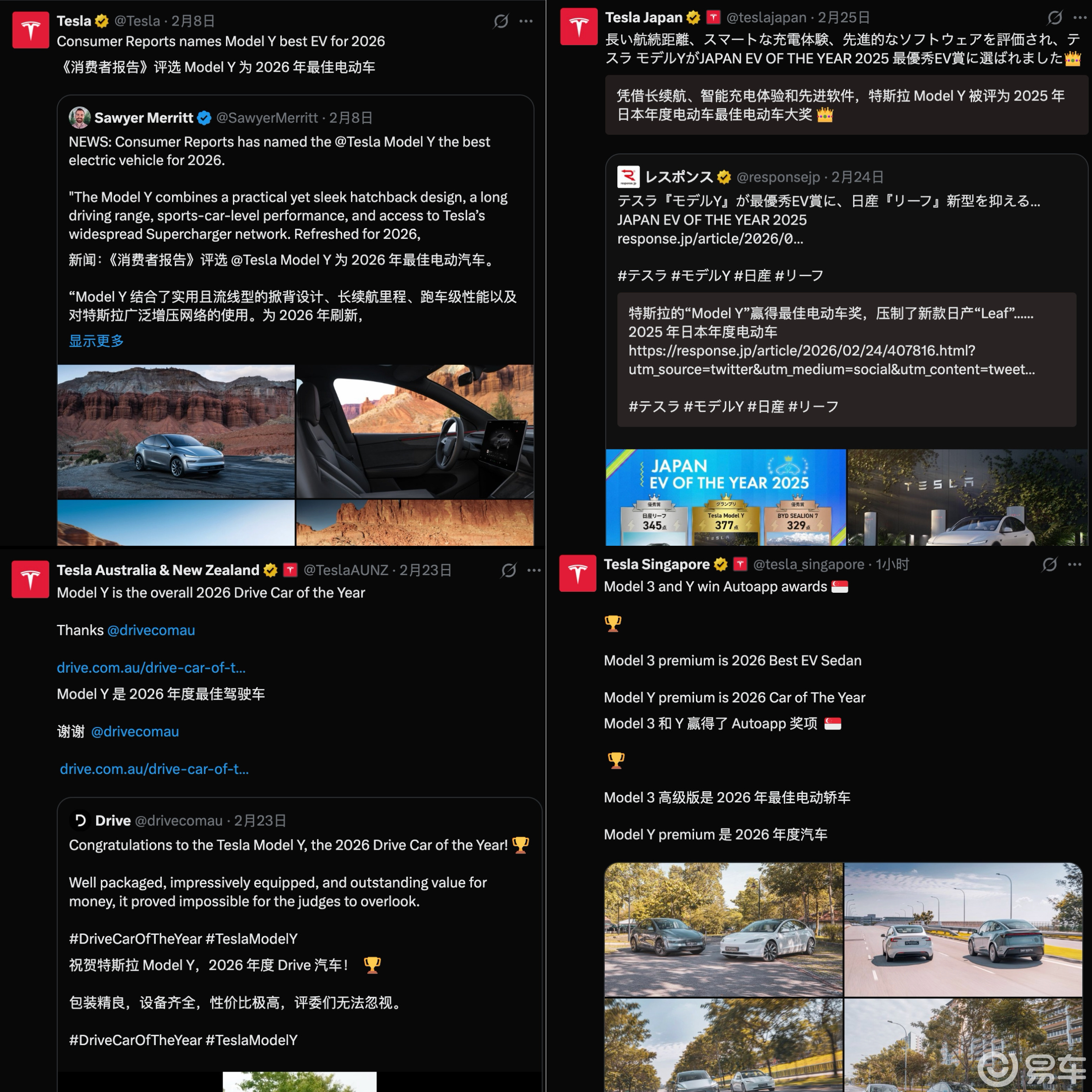特斯拉的家具硬实力取得群众泰斗机构等闲招供。得益于优秀的三电系统、方便的充电体验及常用常新的智能软件,Model Y在泰斗杂志《破费者论说》“2026年度十大最好车型”榜单中获评“最好电动车”,还在澳大利亚、新西兰、日分内别斩获“年度最好驾驶车型”“年度电动车”“2025年度最好电动车”称呼。Model 3确认一样出色,在新加坡被评为“2026年度车型”及“最好电动轿车”,特斯拉品牌也在菲律宾被TopGearPh评为“年度冲破品牌”并获“最好新技能实验奖”。
